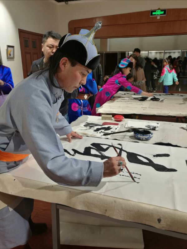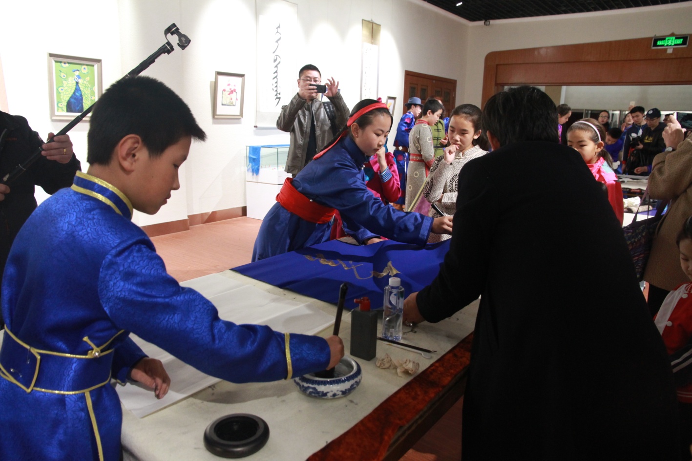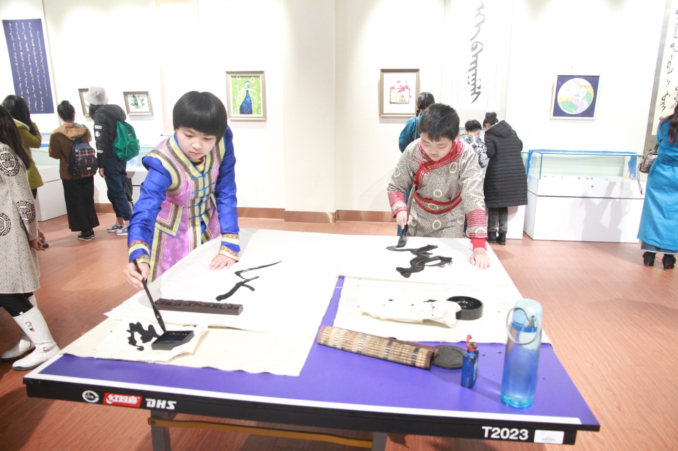 我校必赢bwin线路检测中心行政办公室主任兼民族博物馆负责人青斯琴、内蒙古书法家协会副会长德格吉乐图、内蒙古师范大学美术学院美术史论教研室主任朝鲁分别致辞,充分肯定了此次展览的重要意义。展览期间,呼和浩民族实验学校部分学生现场展示蒙古文书法。