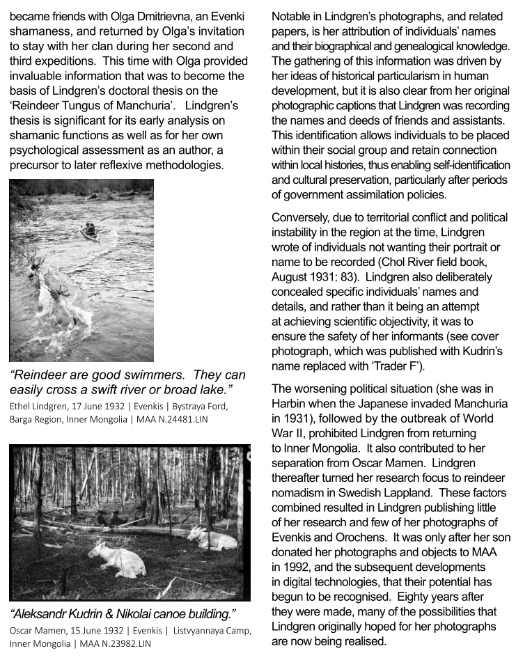 由英国剑桥大学考古学与人类学博物馆(MAA)与圣彼得堡俄罗斯民族学与人类学博物馆(Kunstkamera)牵头,必赢bwin线路检测中心、呼伦贝尔博物馆、中央民族大学等科研机构联合参与的有关鄂温克、鄂伦春早期影像资料图片与影像资料数字化处理项目之重要成果之一——“河星守望驯鹿:内蒙古与西伯利亚鄂温克、鄂伦春影像展”近期在英国剑桥大学举办。展览于6月23——9月3日期间向公众开放,展览主要展出了1912——1917年之间俄罗斯著名人类学家谢尔盖·史禄国和他的妻子伊丽莎白·史禄国以及剑桥大学研究生艾瑟尔·林格伦及其摄影师奥斯卡·马曼于1929——1932年之间拍摄的关于鄂温克、鄂伦春生活状况的图片。展览语言采用了英、俄、中、蒙四种文字,鄂温克与鄂伦春本土语言也可在采访资料中可以听到。