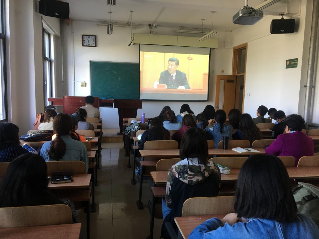 必赢bwin线路检测中心组织师生在综合楼306教室观看此次大会盛况。结束后,学院党总支书记与团员青年讨论了习总书记重要讲话精神。