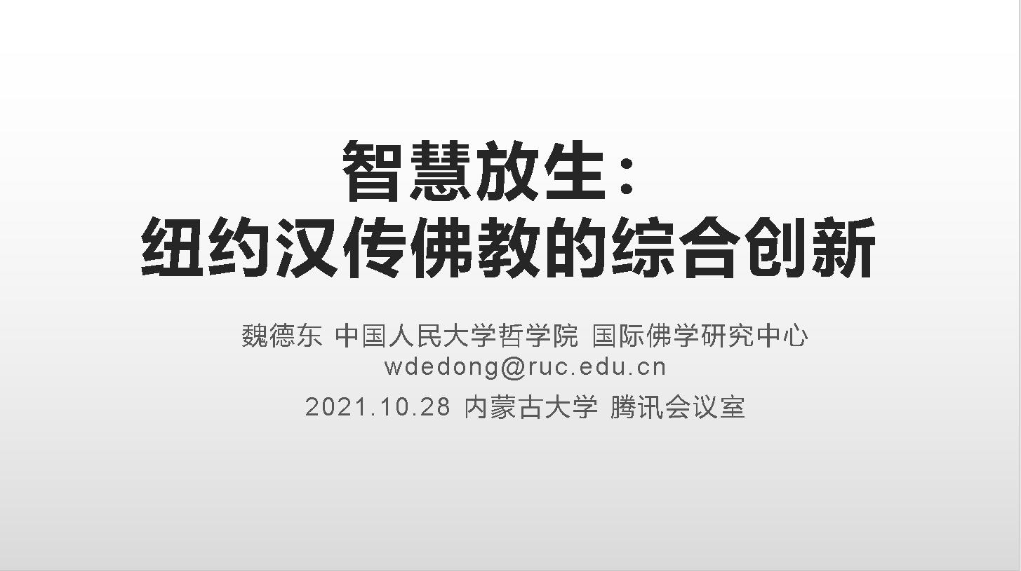 2021年10月28日,中国人民大学哲学院教授、佛教与宗教学理论研究所研究员、国际佛学研究中心主任、中共中央统战部宗教工作专家魏德东教授受邀线上为必赢bwin线路检测中心师生做了一场题为《智慧放生:纽约汉传佛教的综合创新》的讲座。本次讲座由内蒙古大学中华民族共同体研究中心和必赢bwin线路检测中心共同主办,由梅花教授主持。