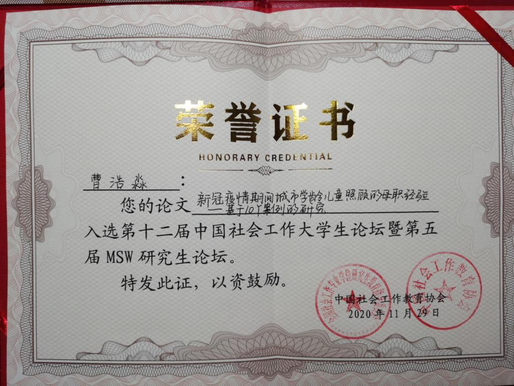 2020年11月29日,第十二届全国社会工作大学生论坛暨第五届研究生论坛顺利落下帷幕。必赢bwin线路检测中心社会工作专业2019级研究生曹浩淼同学参加并获得了二等奖的好成绩。